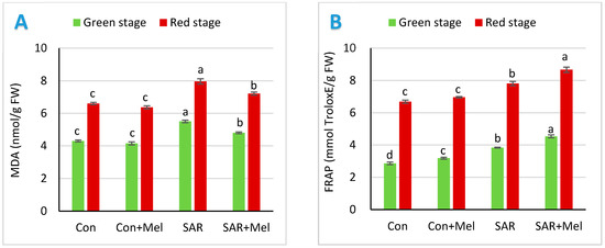 To verify the protective impact of melatonin against SAR-induced oxidative damage and total antioxidant activities, we analyze ferric reducing antioxidant power in tomato fruits. The total reducing antioxidant potential characterizes the capacity to inhibit the oxidation process under different stress condition. Compared with the fruits of control plants, SAR exposure increased sharply fruits’ antioxidant power by 34.27% and 16.74% at mature green and red stages, respectively (Figure 3B). The results indicated that fruits activated their antioxidant system against oxidative stress derived by SAR stresses. Similar findings have been reported in another research which revealed that the total reducing antioxidant power increased by activating antioxidants to relieved stress-induced oxidative damages in fruits [33]. Moreover, the melatonin supplementation to SAR-stressed plants causes further increase in the antioxidant power in fruits by 18.23% and 10.88% at mature green and red stages, respectively compared with the fruits of SAR-stressed plants (Figure 3B). Meanwhile, our findings agreed with another study that exogenous melatonin advanced the stress tolerance by inducing their antioxidant potential against oxidative stress [34].