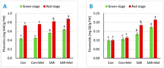 To explore the impact of melatonin treatment on health promoting antioxidant compounds in tomato fruits against SAR stress, we assessed phenolics and flavonoids contents in fruits. The phenolic and flavonoids acted as a non-enzymatic antioxidant compound under stress condition and considered as important antioxidants in human nutrition [35]. These health promoting bioactive compounds improved the protection capacity of human against thrombosis and tumorigenesis [36]. As shown in Figure 4, the total phenolic and flavonoids content in fruits were increased in fruits of SAR-stressed plants by 27.27% and 30%, respectively at mature green stage, and 12.33% and 80%, respectively at red stage compared with those in the fruits of control plants. These findings agreed with other results that the plant enhances the non-enzymatic antioxidants like phenolic and flavonoids to eliminate oxidative stress when plants exposed to abiotic stress [33,37]. In addition, compared with the fruits of SAR-stressed plants, the phenolic and flavonoids contents were leading to increases of 14.29% and 30.77%, respectively at mature green stage and 7.32% and 16.67%, respectively at red stage of fruits with melatonin supplement in SAR-stressed plants (Figure 4). The consequences of our results supported the perception that exogenous melatonin plays a significant role to enhances the plants defense system in environmental stress condition by uplifting ROS-scavenging antioxidant non-enzymes against oxidative damage [38].