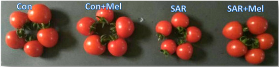 To evaluate the exogenous melatonin’s impact in SAR-stress condition, yield attributes of tomatoes were estimated. Yield traits reduction indicates the serious symptom of plants those are exposed to any environmental stress. As shown in Table 2 and Figure 5, the values of fruit’s diameter, fruit’s length, number of fruits per plant, and average weight of a fruit were reduced by 23.65%, 23.74%, 52.85%, and 37.20%, respectively but dry matter percentages of fruits increased by 13.76% in plants exposed to SAR compared with those in control plants. Our results agreed with previous observation that the yield components were dramatically reduced by the application of simulated acid rain in plants [19,21]. However, supplementation of exogenous melatonin to SAR-stressed plants exhibited visible improvement of these yield attributes by 15.25%, 16.74%, 68.13%, 34.94%, and 4.09%, respectively compared with SAR-stress plants (Table 2). However, insignificant improvements were observed in between the fruits of control plants and control plants treated with melatonin treatments (Table 2). Meanwhile, the findings of our experiments indicated that exogenous melatonin significantly improved the reduction in yield components of tomatoes when plants exposed to SAR condition. Moreover, this consequence agreed with the concept of other researcher that the spraying of melatonin boosted the stress tolerance of plants which helps in possible mitigation of yield and yield components under abiotic stress condition [26].