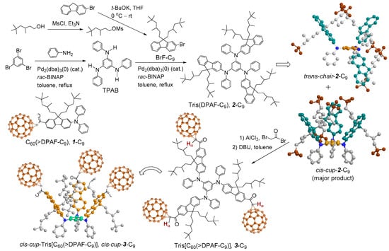 Sample Availability: Samples of all synthetic compounds including cis-cup-tris(BrDPAF-C9) and cis-cup-tris[C60>(DPAF-C9)] are available from the authors.. |