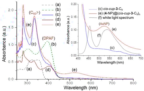 UV-vis spectra of (a) cis-cup-tris(DPAF-C9) (cis-cup-2-C9), (b) cis-cup-tris(BrDPAF-C9), (c) cis-cup-tris[C60(>DPAF-C9)] (cis-cup-3-C9), (d) C60(>DPAF-C9) (1-C9), (e) (4-NP)@(cis-cup-3-C9)n (5-NPs), and (f) white light emission spectrum, where (a) and (b) were taken in EtOAc and (c), (d), and (e) were taken in toluene. The concentration of all samples is 1.0 × 10−5 M.