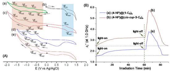 (A) Cyclic voltammograms (CV) of (a) C60>, (b) cis-cup-tris(DPAF-C9), (c) C60 (>DPAF-C9) (1-C9), (d) cis-cup-tris[C60(>DPAF-C9)] (with no light), and (e) cis-cup-tris[C60(>DPAF-C9)] (after white LED light irradiation for 30 min) at different voltages vs Ag/Ag+ in a solution concentration of 1.0 × 10−3 M in CH3CN-CH2Cl2, containing (n-butyl)4N+-PF6− electrolyte (0.2 M), using Pt as working and counter electrodes and Ag/AgCl as the reference electrode at a scan rate of 10 mV/s. (B) Irradiation time-dependent relative dielectric constant (εr′) amplification of trilayered core-shell nanoparticles of (a) (γ-FeOx@AuNP)@[C60(>DPAF-C9)]n (6-NPs) and (b) (γ-FeOx@AuNP)@{cis-cup-tris[C60(>DPAF-C9)]}n (5-NPs) at the frequency of 1.0 GHz. White LED light irradiation period was 60 min.