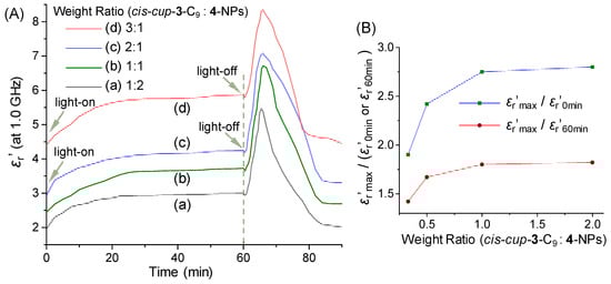 (A) Irradiation time-dependent relative dielectric constant (εr′) amplification of trilayered core-shell nanoparticles of (γ-FeOx@AuNP)@{cis-cup-tris[C60(>DPAF-C9)]}n (5-NPs) with a different weight ratio of cis-cup-3-C9 vs γ-FeOx@AuNP (4-NPs) at the frequency of 1.0 GHz with a white LED light irradiation period of 60 min. (B) Relative dielectric constant (εr′) ratios of the values at peak maximum vs that at either 0 min or 60 min, showing a progressive increase of the degree of dielectric amplification.