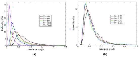Distribution of the maximum value, σmax(t), sampled over 100 ps MD simulations where respective partitionings contain 1 QM solute and 32 QM solvent molecules. (a) The black, red, green, blue and purple lines represent the simulations with 40, 60, 80, 100 and 200 partitionings, respectively. All the simulations employed D = 0.75; (b) The black, red, green and blue lines represent the results from the simulations with D = 0.50, 0.75, 0.90 and 0.99, respectively; all the simulations were performed with 60 partitionings.