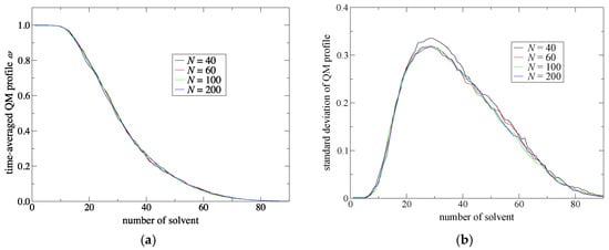 (a) Time-averaged QM profiles, ω, and (b) their standard deviations obtained from 100 ps SCMP simulations. The horizontal axis represents the solvent number from the QM solute. Black, red, green and blue lines represent the results obtained by the SCMP method with number of partitionings equal to 40, 60, 100 and 200, respectively.