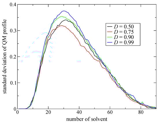 To discuss instantaneous spatial continuity, we evaluated the standard deviations (SDs) of the instantaneous QM profiles along the MD simulation as shown in Equation (14). If the instantaneous QM profiles agree with the time averaged QM profiles at every MD time step, the standard deviation should be small. However, Figure 3b shows that the obtained SDs are remarkably large, with a maximum value of about 0.3 at around the 32nd solvent molecule from the QM solute. It is also notable that the solvent number, 32nd, showing the largest SD value agrees with the number of QM solvent molecules contained in the respective partitionings. These large SDs imply that the QM profiles significantly fluctuate in the course of the MD time. As a result, the entire shape of the instantaneous QM profiles does not agree with the expected shape (time-averaged QM profiles) displayed in Figure 3a. In other words, there is still a room for improvement of spatial continuity for MD time step, while it can be achieved with respect to time average.