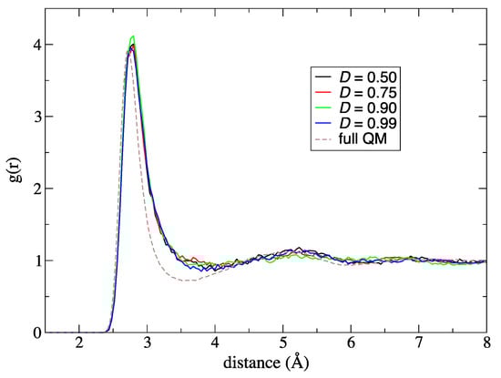 To evaluate the effect of spatial continuity on solvation structure, we calculated the time-averaged QM solute oxygen-centered radial distribution functions for the solvent oxygen atoms (Figure 5). Notably, the radial distribution functions (RDFs) do not show any distinct difference for different values of D. We also did not observe any clear difference in the RDFs when compared to different number of partitionings (data not shown). Considering that all the present simulations realize smooth switching of the QM profiles on time-average (Figure 3a) and that the present RDFs are also time-averaged, it seems reasonable that the RDFs correspond to the time-averaged QM profiles (and not with the instantaneous QM profiles). Since the smooth QM profiles on time average were already achieved even with previous code [11], it is also reasonable that any difference does not appear in the RDFs. When compared full DFTB3/3OB results, the SCMP reproduced the first and second peaks of RDF well, while the first minimum is shifted to larger distance.