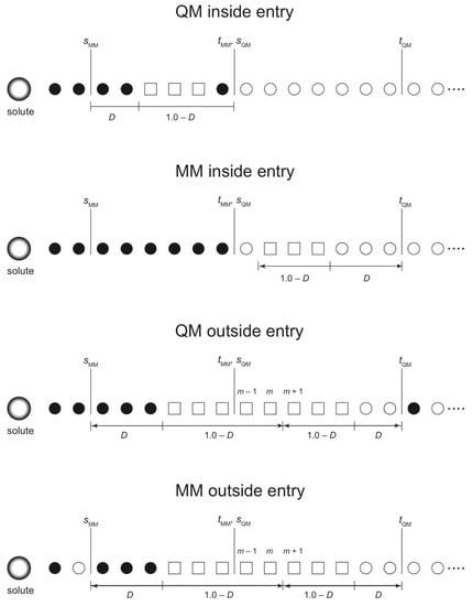 Let a QM outside entry be a process where a disordered partitioning with σ = 0 because OQM = 0 happens to be reweighted again. For instance, suppose that a QM solvent molecule diffuses beyond tQM and accordingly OQM = 0. Then, the diffused QM solvent molecule may happen to come back within tQM again, leading to σ > 0 with OQM > 0. Likewise, let an MM outside entry be a process where σ > 0 when an MM solvent molecule moves beyond sMM of the QM solute. In contrast to the QM entries, the MM entries are always available regardless of range parameters s and t.