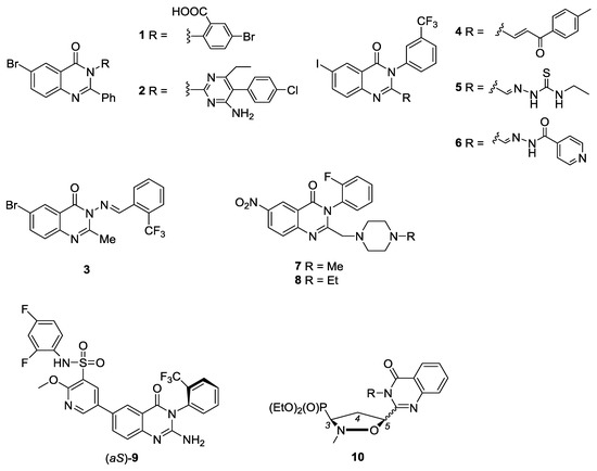 The antiviral activity of compounds containing the C6-substituted quinazolin-4-one framework has been discovered in recent years (Figure 1). For example, 5-bromo-2-(6-bromo-4-oxo-2-phenyl-4H-quinazolin-3-yl)-benzoic acid 1 was reported to possess distinct antiviral activity against both herpes simplex viruses 1 and 2 (HSV-1 and HSV-2) and vaccinia virus (VACV) (EC50 = 12 μg/mL) [19], whereas compound 2 exhibited activity against vaccinia virus in E6SM cell cultures (MIC of 1.92 μg/mL) [20]. Another analogue, i.e., 2-methyl-3-(substituted-benzalamino)-4(3H)-quinazolinone 3, was found to exhibit antiviral activity against tobacco mosaic virus (TMV) in vivo. Compound 3 showed curative effects of 54%, which was slightly higher than that of a reference drug, Ningnanmycin [21]. Very recently quinazolin-4(3H)-ones 4–6 were synthesized and evaluated for inhibitory action on the replication of influenza A virus (H5N1), as well as to test toxicity on in vitro cell lines. In general, quinazolin-4(3H)-ones containing a chalcone skeleton 4, thiosemicarbazone 5, and hydrazide 6 showed moderate antiviral activity against H5N1 (inhibition rate: 38%, 47%, 25%, respectively, for 4, 5, 6) compared to a reference drug, Zanamivir [22]. In addition, compounds 7 and 8 possessing a nitro group at C6 were reported as potent inhibitors of Venezuelan Equine Encephalitis Virus (VEEV) (EC50 = 0.8 μM, CC50 = 50 μM) [23]. Quinazolinone (aS)-9 displayed high selectivity for PI4KIIIα and appeared to be potent inhibitors of hepatitis C virus (HCV) replication in vitro. Moreover, compound (aS)-9 exhibited higher potency for PI4KIIIα than its atropisomer aR (pIC50 of 8.3 vs. 6.9) and an improved selectivity range (2.7–3.2 vs. 1.4–2.1) against the other lipid kinases [24].
