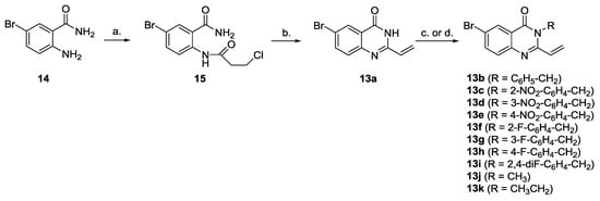 The respective 3-substituted 6-bromo-2-vinyl-3H-quinazolin-4-ones 13a–k were synthesized starting from the commercially available isatoic acid anhydride, which was first reacted with bromine and then transformed into 5-bromoanthranilic acid amide 14 according to the procedure in the literature [27,28]. Reaction 5-bromoanthranilic acid amide 14 with 3-chloropropionyl chloride followed by cyclization and dehydrohalogenation led to the formation of 6-bromo-2-vinyl-3H-quinazolin-4-one 13a, which was then used as a key intermediate in the preparation of N3-substituted derivatives 13b–13k via alkylation with the respective benzyl bromides, as well as with methyl or ethyl iodide [29] (Scheme 2).