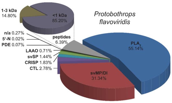 The percentage composition of the venom ingredients was calculated on the basis of a combination of the RP-HPLC chromatogram and SDS-PAGE evaluation [71,72]. The peak integrals at UV214nm were measured in comparison to the total sum of peak integrals. In the case of multiple component elution in an HPLC fraction identified by SDS-PAGE staining, the integrated density ratio of the stained bands was respectively used for the emphasis of peak integrals.