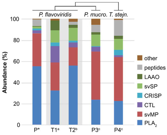 For all three snakes, the main venom families are svMPs and PLA2s, followed by CTLs, CRISPs, svSPs, and LAAOs with abundances of <15%. While of the above-mentioned P. flavoviridis venom (P* in Figure 4) comprises a big portion, i.e., >55% PLA2s and >30% svMPs, the venoms of P3 and P4 are alike to each otther. The main protein share of both venoms (P3 and P4 in Figure 4) is contributed by svMP, with >40%, while the PLA2s (~25%) only constitute the second most abundant protein component and thus stand in contrast to P*. The lesser protein families are twofold more abundant in P3 and P4, and reflect a broader diversity of the venomous components in theses snakes. Particularly, the svSP with >10% seemed to be more abundant in the P. mucrosquamatus and T. stejnegeri, than in the P. flavoviridis.