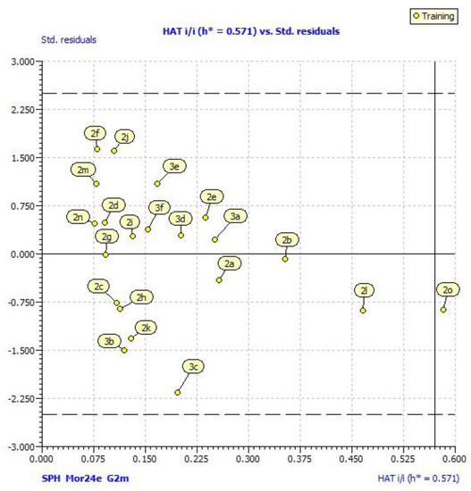 Investigation of the applicability domain of a prediction model was performed by leverage plot (plotting residuals vs. leverage of training compounds). The warning leverage h* is defined as 3p′/n, where n is the number of training compounds and p′ is the number of model adjustable parameters [44].