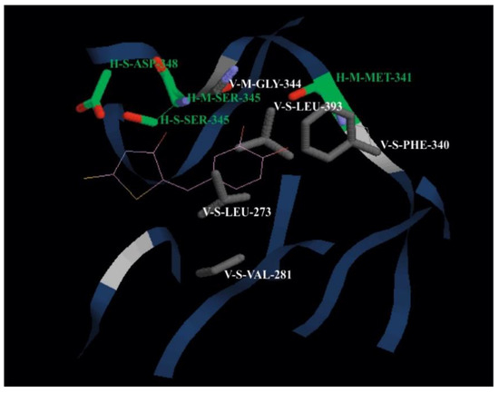 Interactions of the most active compound 2e with the nearby amino acid group of the tyrosine kinase Hck. The following rows show the interactions between the active compounds and the interacting residue groups. H and V indicate the interaction types (H bond and van der Waals interactions, respectively); M and S indicate the main chain and the side chain of the interacting residue, respectively. The hydrogen-bondings are coloured in green and van der Waals (white) if the energy ≤−2.5. Docking pose of ligand is pink, where yellow denotes sulphur atoms and blue nitrogen atom.