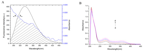 The UV-vis absorption spectra were obtained by the NanoDrop 2000c spectrometer (Thermo Fisher Scientific, Waltham, MA, USA) and recorded from 190 to 450 nm. In the experiment, 2.5 mL bLf solution was titrated by continuous additions of TCH. The final concentrations for TCH were 0, 1.0, 2.0, and 3.0 × 10−6 mol/L, respectively.