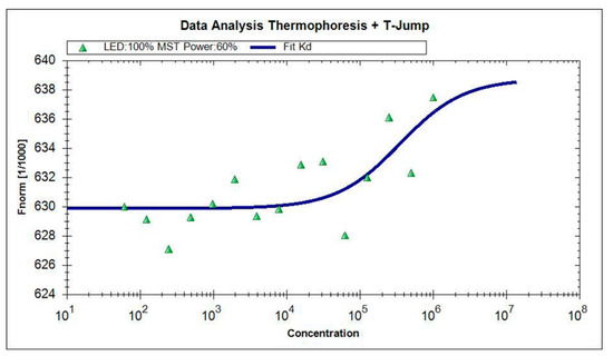 MST was utilized to further prove the interactions results by fluorescence spectroscopy. The titration curve fitting by MST was shown in Figure 3. The equilibrium dissociation constant Kd value computation formula is as follows: