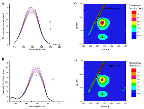 Fluorescence EEM spectroscopy is a rapid, selective, and sensitive technique. It has been proven to be a useful technique to provide detailed information about the conformational change of proteins [27]. In this paper, the data obtained from it was recorded in Figure 4C,D.