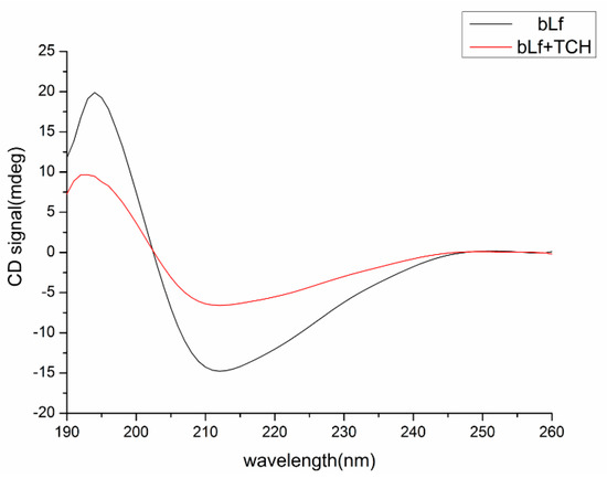 For the CD spectroscopy experiment, a chirascan circular dichroism spectrometer (Applied PhotoPhysics, Surrey, United Kingdom) was used to analyze the structural change of bLf before and after the addition of TCH at far-UV (190–260 nm) regions. The concentration of bLf was 5.0 × 10−5 mol/L, adding a certain amount of TCH (1.0 × 10−4 mol/L), to give a final molar ratio of 1.0.