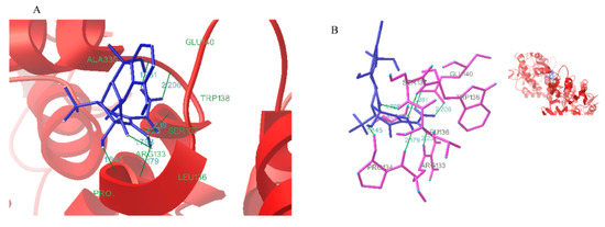 As shown in Figure 6, a careful inspection of the binding site suggested the closer contact of hydroxyl groups of TCH with the tryptophan amino acid residue. The results indicated that three amino acid residues (Arg133; Ser137; Trp138) were involved in bLf binding with TCH [16]. Arg133 is a polar amino acid, so we speculate that Van der Waals forces may be involved in the interaction between protein and TCH. In addition, hydrogen bonds have appeared in the molecular docking diagram, indicating that there is hydrogen bonding in the interaction between protein and TCH. These results showed the binding of TCH to bLf is predominantly by hydrogen bonds and hydrophobic contacts within the hydrophobic core of proteins. By calculating the hydrophobicity, we found that S0 (bLf-ANS) = 3.791 (Figure 7C) and S0 (bLf-TCH-ANS) = 2.836 (Figure 7D). Therefore, we speculated that the addition of TCH not only altered the bLf structure but destroyed the original hydrophobicity, making it more likely to be exposed in aqueous solution. These results correlate well with our other conclusions.