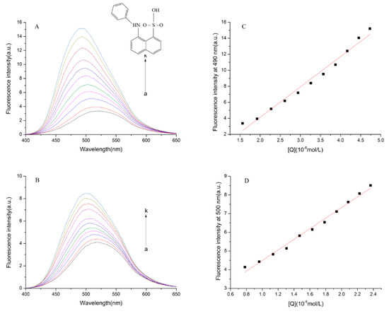 The structure of ANS. Fluorescence emission spectra of bLf-ANS system (A) and bLf-TCH-ANS system (B) with different concentration of bLf. Variation in relative fluorescence intensity of bLf-ANS (C) at 490 nm and bLf-TCH-ANS (D) at 500 nm with different concentration of bLf, c (TCH)/c (bLf) = 1:1.