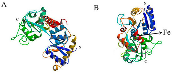Bovine lactoferrin (bLf) is an extremely polyfunctional iron-binding whey protein and its biological properties are believed to be due to its iron binding capacity. Antibiotic residues (TCH) in milk may affect the interaction between bLf and iron ions, which can affect the function of bLf. Spatial organizations of apo- and Fe-bLf (based on X-ray structural analysis) are shown in Figure 8. The average content of bLf in milk is about 1.3 g/L [6], and the content of iron in milk is 210 μg/L [31]. Thus, the ratio of bLf to iron in milk can be roughly calculated. We simulated the environment of bLf and iron in milk, Figure 9A shows the fluorescence quenching spectra regarding the effect of TCH on it.