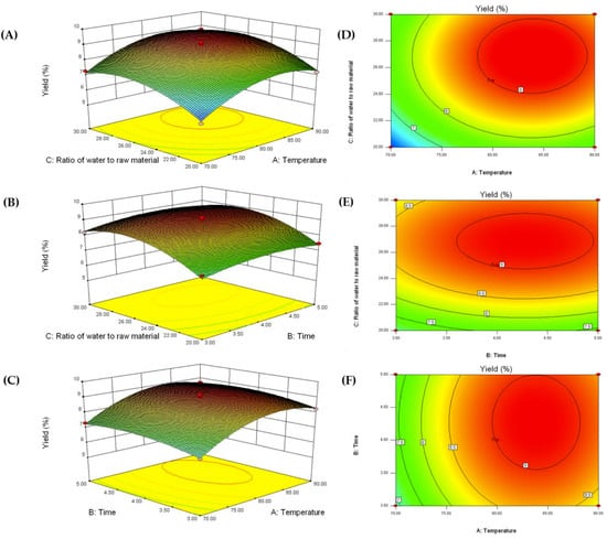 Figure 1A,D, depict the changes in extraction yield when the extraction temperature and extraction time varied across the experimental range when the ratio of water to raw material was fixed at zero. The yield is predicted to increase as the extraction temperature is elevated from 50 to 80 °C. At higher temperatures, the yield is predicted to slightly decrease. Generally, higher extraction temperature can promote the release of polysaccharides from plant tissues, but further increases in extraction temperature may induce polysaccharide degradation [16]. A similar trend was also predicted when extraction time and ratio of water to raw material were varied, as shown in Figure 1B,C.