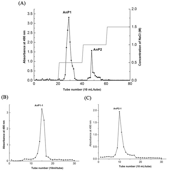 The crude AnPs was purified by DEAE Sepharose Fast Flow via a gradient elution of 0–1.5 M NaCl into two independent fractions (AnP1 and AnP2) as showed in Figure 2A. The peaks AnP1 and AnP2 were further purified by Sephacryl S-300 size exclusion chromatography using 0.1 M NaCl as the mobile phase (Figure 2B,C) to obtain the fractions of AnP1-1 and AnP2-1.