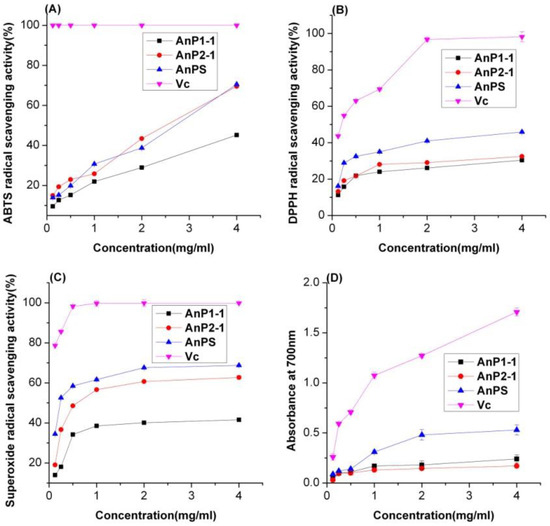The scavenging effects on DPPH free radicals were presented in Figure 4B. The scavenging activity of the polysaccharides increased with an increase in their concentration. At a concentration of 4 mg/mL, the DPPH free radical scavenging activities of crude AnPS, AnP1-1, AnP2-1 and Vc were 45.9%, 30.4%, 32.5% and 98.2%, respectively. Compared with the results of the ABTS assay, the AnPS and its purified fractions had limited scavenging abilities for DPPH. The reason might be due to the facts that the ABTS assay is more suitable for evaluating hydrophilic antioxidants [22].