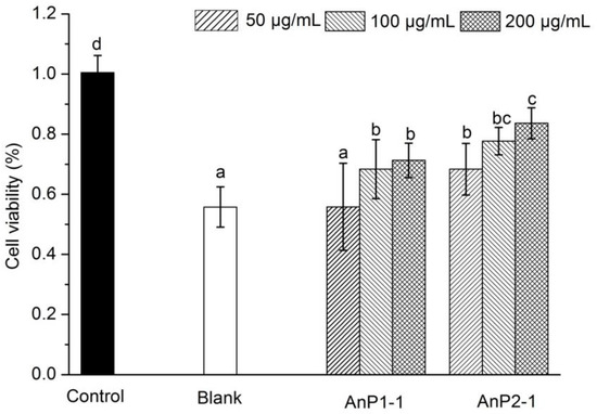 The protective effect of AnP1-1 and AnP2-1 against H2O2-induced oxidative injury in RAW264.7 cells. The different letters represent significant differences between different groups (p < 0.05).