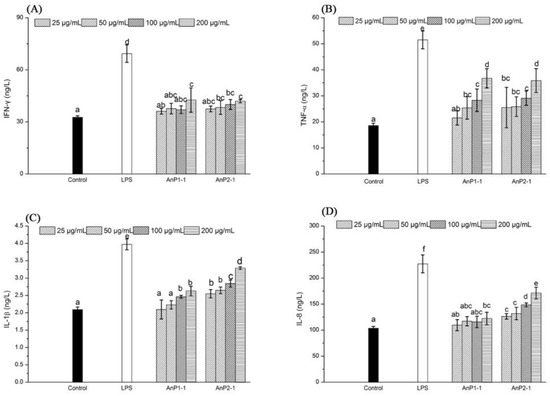 The assay of immunostimulatory activity in vitro was carried out using Caco-2 cells model according to the previous method [26]. 200 μL/well of Caco-2 cells suspension was pipetted into a 96-well culture plate and incubated for 12 h. The culture medium was replaced by new culture medium with different concentrations (0, 25, 50, 100 and 200 μg/mL) of samples (AnP1-1 and AnP2-1) or LPS (1 μg/mL). After culture of 24 h, the levels of IFN-γ, TNF-α, IL-1β, and IL-8 in the supernatants of the Caco-2 cells from each group were evaluated by using ELISA kits according to the manufacturers’ protocols (Nanjing Jiancheng Bioengineering Institute, Nanjing, China). LPS was used as positive control.