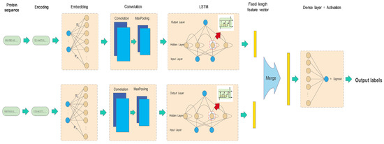 Architecture of the deep learning model: Feature extractions and transformations are the most trivial tasks in the scenarios of traditional machine learning and most of deep learning. In this work, we made a simple encoding of amino acids in the protein sequence and then left the rest of the work to be done automatically by networks. Specifically, the two encoded sequences of interaction pairs were separately fed into layered networks, including embedding, CNN, and LSTM layers. Then, a concatenated vector of the two outputs from the previous layer was wired as the input of the fully connected neural network (dense layer). Finally, the Adam optimizer was applied to learn the network weights in a back-propagation fashion. The details of the proposed framework are shown in Figure 1.