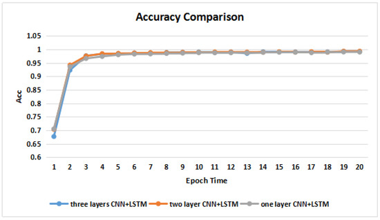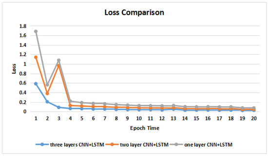 To verify the convergences and accuracies of the models with different layers of CNNs, we conducted two additional experiments with one and two layers of CNNs. As shown in Figure 4 and Figure 5, the model with a higher number of CNN layers had a faster convergence speed in terms of the loss value. There was no significant difference in their accuracies among the three models trained over epoch times.