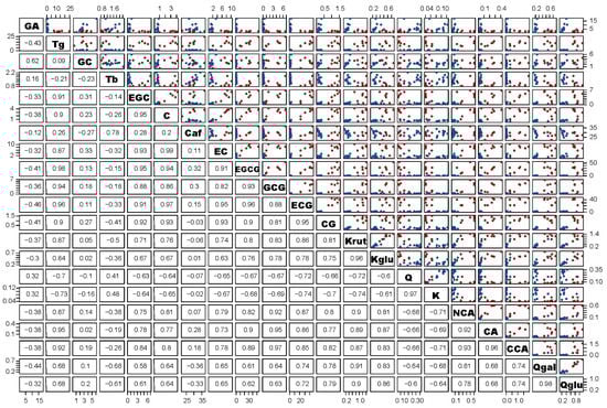 Scatterplot analysis of all analyzed biochemical compounds. Blue spots: phenolic content analyzed in young ripened pu’er tea (YPT), red spots: phenolic content analyzed in aged raw pu’er tea (APT).