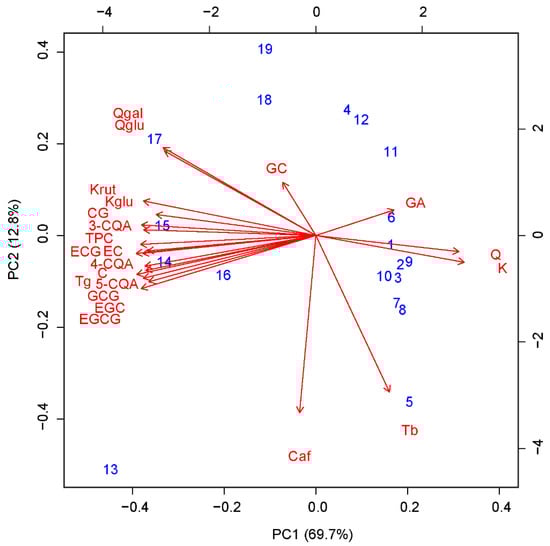 The visualization of the principal component analysis (PCA) illustrates commonalities and clustering among the analyzed compounds. Figure 2 shows the biplot graph based on PCA for all analyzed biochemical compounds. The first component explains 69.7% of total variance, the second 12.8%. The examined 19 tea samples can be clearly clustered into two groups: Number 1–12 refer to YPT samples and 13–19 to APT samples. Differentiation between YPT and APT is primarily due to the first principal component. YPT samples are mainly characterized by high GA, Q and K values, and low Q-gal, Q-glu, K-rut, K-glu, CG, 3-CQA, TPC, EC, ECG, CCA, C, Tg, CA, GCG, EGC, and EGCG values. For APT sample, characteristics are the other way round. Ca, Tb and GC loaded more strongly on the second component, which did not result in classification of the two tea types. PCA shows that tea samples from different production years (Table 1), such as shu 1980 and shu 1994 (No. 11 and 12) and sheng 1980 and sheng 1992 (No. 18 and 19) share common characteristics based on chemometric analysis.