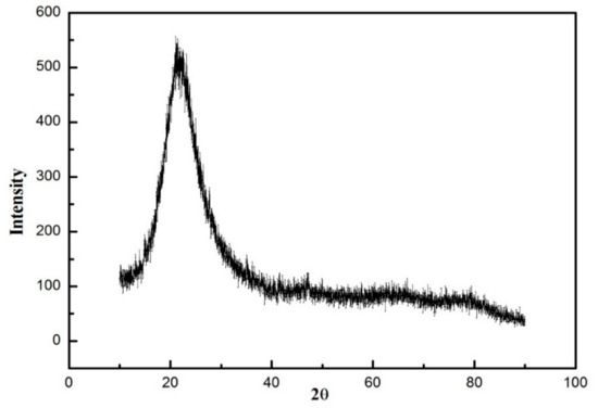 A total of five samples were prepared and denoted as 1–5, according to the Si/TMCS/HMDS molar ratio of 1:1:0, 1:0.5:0.5, 1:0.375:0.375, 1:0.25:0.25, and 1:0.125:0.125, respectively. The corrosion behavior was revealed by using samples 1 and 2. The samples 2, 3, 4, and 5 were designed to optimize the amount of mixed silylation agents. The raw material, dislodged sludge, is a kind of industrial by-product and its composition detected by X-ray fluorescence (XRF) is listed in Table 2. It can be seen that dislodged sludge is predominantly composed of silica (up to 99.37 ± 0.02 wt %), together with minor impurities, such as MgO, Fe2O3, MgO, and so on. The dislodged sludge is amorphous, as shown by the XRD pattern in Figure 1, where only a broad peak, characteristic for non-crystalline solid, is observed.