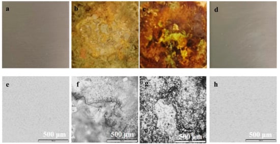 Digital photos (a–d) and optical microscope images(e–h) of the stainless steel slice exposed to different drying atmosphere for different time (a,e: fresh steel; b,f: trimethylchlorosilane (TMCS) as sole silylation agent, 36 h; c,g: TMCS as sole silylation agent, 60 h; d,h: equimolar mixture of TMCS and hexamethyldisilazane(HMDS) as silylation agent, 36 h).