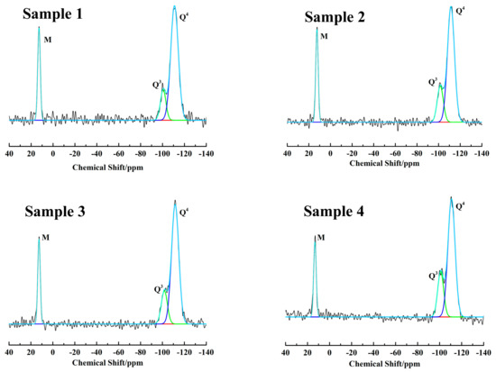 The amount of CH3 groups and surface silanols in the samples can be quantitatively calculated from the Gaussian-fitted resonance M and Q (Q3 + Q2), respectively. The relative amount (mol %) of different types of silicon atoms can be calculated by integrating the Qm and M resonances and the results are summarized in Table 4. The absolute values (mmol/g) for the Si-OH and Si-CH3 in the samples can be determined based on the following formula [32], where the item I represents the molar concentration (mol %) of Qm (m = 2–4) and M species.