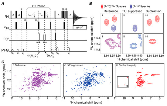 Traditional approaches to map PPIs at an atomic level involve repeat experiments with reverse labeling patterns such that the interaction is probed from both binding partners. Prior to the introduction of the spin-echo filtering experiment by Bax et al. [25], three-bond homonuclear 1H-1H J couplings had been used to derive backbone and side-chain conformational restraints [26,27,28,29,30,31]. This new experiment relied on measuring the magnetization loss due to unresolved J coupling and utilized an interleaved detection method where two spectra are recorded simultaneously but differ by 180° pulse positions on the 15N channel. The spin-echo filtered experiment introduced by Bax is the building block for the Carbonyl Carbon Label Selective (CCLS) 1H-15N HSQC pulse sequence [32], which requires specific isotopic labeling to simultaneously map the chemical shift perturbations from two binding partners. The CCLS 1H-15N HSQC pulse sequence utilizes spin-echo filtering with a short magnetization transfer period between 15N and 13C′ in order to detect 1H-15N correlations adjacent to the NMR inactive (12C′) carbonyl groups (Figure 1A). Building on the constant time (CT) HSQC, the CCLS 1H-15N HSQC necessitates the acquisition of two spectra, a reference spectrum, and a suppression spectrum in an interleaved manner. The reference spectrum is acquired using the pulse sequence reported in Figure 1A with the 180° pulse on 13C′ during the 15N CT evolution period applied at position a as proposed by Vuister et al. [25], which allows for the removal of 13C′-15N coupling. The suppression spectrum is acquired with the 180° 13C′ pulse at position b, leaving 13C-15N J coupling active, and converting the transverse in-phase magnetization of 15N spins linked to 13C′ to antiphase magnetization. This antiphase magnetization contains components in both the x-direction and y-direction. The π 1H and 13C pulses applied at the end of the 15N evolution convert the y-component, 4HzNyC′z, to an unobservable multiple quantum coherence, 4HyNzC′y, while the x-component, 4HyNzC’y, is de-phased by the G2 gradient (Figure 1A). As a result, signals from 1H-15N groups coupled to 13C′ are suppressed while signals from 1H-15N groups coupled to 12C′ are unaffected. The suppression spectrum can then be subtracted from the reference spectrum, which leaves the U-15N, 13C species observable (Figure 1B).