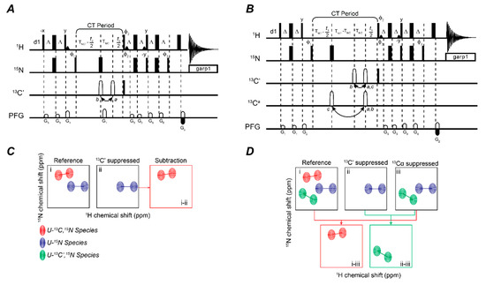 Masterson et al. applied the CCLS pulse sequence element to deconvolute PPIs in a ternary mixture simultaneously [45]. The dual carbon label selective (DCLS) 1H-15N HSQC experiment requires three labeled binding partners with the first species U-15N labeled, the second 15N, 13C′ labeled, and the third U-13C, 15N labeled. The deconvolution of these spectra follows the same spin-echo filtering theory as CCLS with additional filtering of Cα coupled spins (Figure 2A). Cα suppression requires a longer TNCα delay due to both inter-residue and intra-residue 1H-13Cα J coupling [46]. Increasing the TNCα delay nullifies protein backbone conformation dependency of 1JNCα and 2JNCα since it completely suppresses the signal from 1JNCα while inverting the residual signal intensities of 2JNCα.