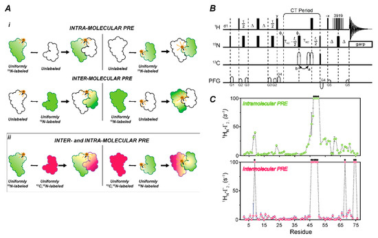 - Olivieri, C. Simultaneous detection of intra- and inter-molecular paramagnetic relaxation enhancements in protein complexes. J. Biomol. NMR 2018, 70, 133–140. [Google Scholar] [CrossRef] [PubMed]