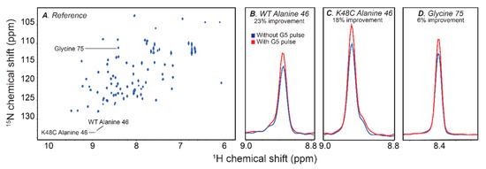 CCLS G5 pulse implementation. (A) CCLS 1H–15N HSQC reference spectrum of 15N, 13C UbiWT, and U-15N UbiK48C mutant. (B) Overlay spectra of the UbiWT alanine 46 peak demonstrating a 23% signal intensity improvement with the G5 pulse. (C) Overlay spectra of the UbiK48C alanine 46 peak demonstrating an 18% signal intensity improvement with the G5 pulse. (D) Overlay spectra of the glycine 75 peak demonstrating a 6% improvement with the G5 pulse. (All figures were cited with permission of Springer Nature).