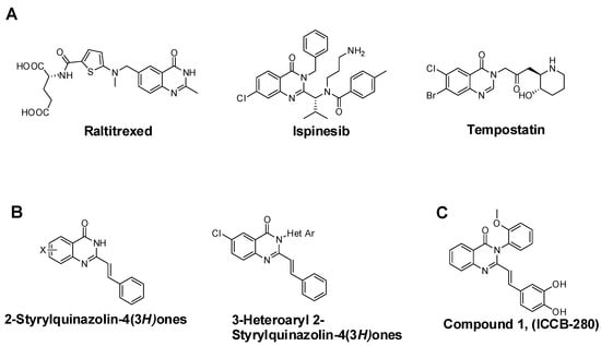 Quinazolinone compounds; (A) quinazolinone drugs in the market and in early development [13,14,15], (B) Styryl quinazolinones explored as tubulin polymerization inhibitors [18,19,20], (C) Styryl quinazolinone 1, (ICCB-280) hit from small molecules C/EBPα inducer screens [22].
