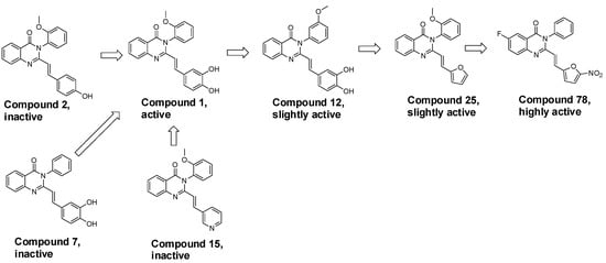 - Raffa, D.; Edler, M.C.; Daidone, G.; Maggio, B.; Merickech, M.; Plescia, S.; Schillaci, D.; Bai, R.; Hamel, E. Synthesis, cytotoxicity, and inhibitory effects on tubulin polymerization of a new 3-heterocyclo substituted 2-styrylquinazolinones. Eur. J. Med. Chem. 2004, 39, 299–304. [Google Scholar] [CrossRef] [PubMed]