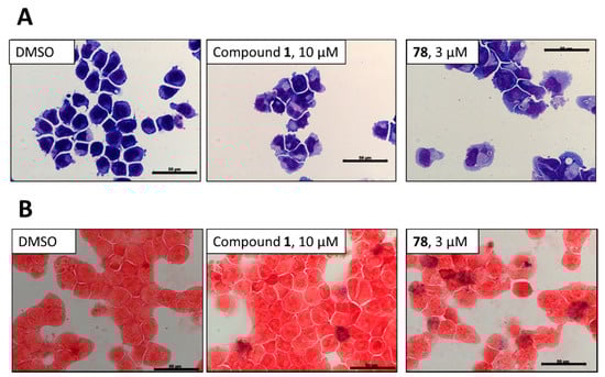 Morphological Analysis and Nitro Blue Tetrazolium Reduction Assay: HL-60 cells were treated with 0.1% DMSO, 10 µM of 1, and 3 µM of 78 for 7 days and stained with Wright-Giemsa. Maximum cell concentrations were adjusted lower than 100,000 /mL. These treated HL-60 cells were incubated with 1.0 mg/mL nitroblue tetrazolium/PBS, and 0.36 µM Phorbol-12-myristate-13-acetate (PMA) at 37 °C for 30–40 min and stained with safranin O. Morphological differentiation and apoptosis were evaluated as − (0–5%), + (5–30%), and ++ (more than 30%), as previously described [21].