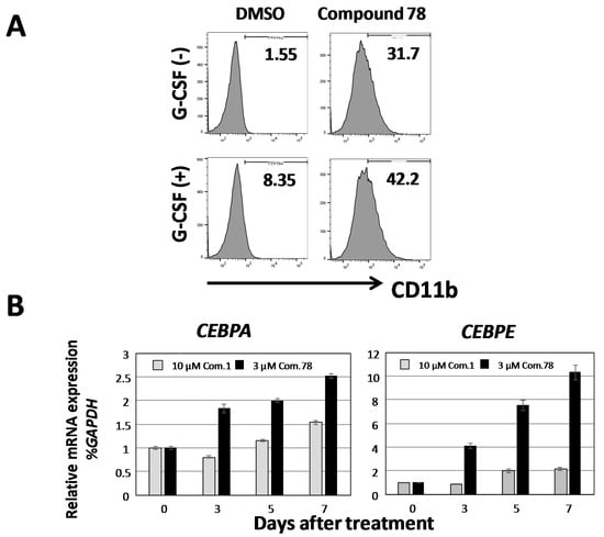 Compound 78 induces the expression of the neutrophil differentiation surface marker CD11b and upregulation of CEBPA and its downstream targets: (A) CD11b positive cells were evaluated by flow cytometry analysis; and (B) expression of CEBPA and CEBPE was determined by quantitative real time PCR analysis.