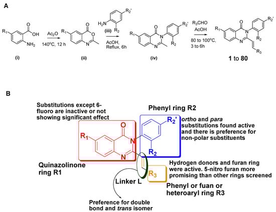 Styryl quinazolinones synthesis, structure, and activity. (A) General synthetic protocol for Styryl Quinazolinone synthesis. (B) SAR of styryl quinazolinones as granulocytic differentiation inducers.