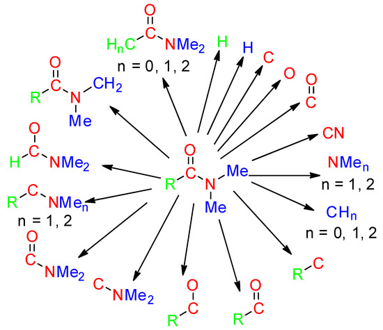 The organic, organometallic and bioorganic transformations are extensively carried out in N,N-dimethylformamide (DMF) or N,N-dimethylacetamide (DMAc). These two polar solvents are not only use for their dissolution properties, but also as multipurpose reagents. They participate in a number of processes and serve as a source of various building blocks giving one or more of their own atoms (Scheme 1).