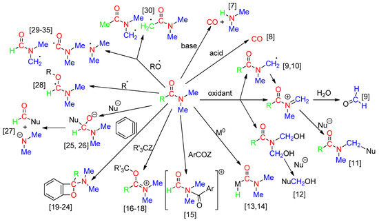 In 2009, one of us reviewed the different roles of DMF, highlighting that DMF is much more than a solvent [1]. Subsequently, this topic has been documented by the teams of Jiao [2] and Sing [3]. For of a book devoted to solvents as reagents in organic synthesis, we wrote a chapter summarizing the reactions consuming DMF and DMAc as carbon, hydrogen, nitrogen and/or oxygen sources [4]. This book chapter tentatively covered the literature up to middle 2015. The present mini-review focuses on recent reactions which involve DM (DM = DMF or DMAc) as a reagent although some key older papers are also included for context. Processes which necessitate the prerequisite synthesis of DM derivatives such as the Vilsmeier-Haack reagents [5] and DMF dimethyl acetal [6] are not surveyed, but a few reactions of the present review involve the in-situ formation of a Vilsmeier-type intermediate (Vilsmeier-type reagents have been extensively used. Search on 26 June 2018 for “Vilsmeier” with SciFinder led to 4379 entries). Color equations, based on literature proposals, are used to easily visualize the DM atom origin. When uncertainty is expressed by the authors or suspected by us, the atom is typed in italic. Mechanistic schemes are not reported, but Scheme 2 [7,8,9,10,11,12,13,14,15,16,17,18,19,20,21,22,23,24,25,26,27,28,29,30,31,32,33,34,35] summarizes different proposed reactions of DM with the corresponding literature references, where DM acts as either a nucleophilic or electrophilic reagent, or leads to neutral, ionic or radical species. The review is divided in Sections depending on the DM fragment(s) which is (are) incorporated into the reaction product.