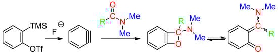 Arynes, which are easily obtained from, for example 2-(trimethylsilyl)phenyl trifluoromethane-sulfonate, undergone a [2 + 2] cyclization with DM giving a benzoxetene and its isomer, the ortho-quinone methide (Scheme 3). Trapping of these intermediates provides various products, which contain the formyl or acetyl CH part and the O atom of DM (Equations (86) [19], (87) [20], (88) [21] and (89) [97]), or the HCNMe2 and O fragments of DMF (see Section 18).