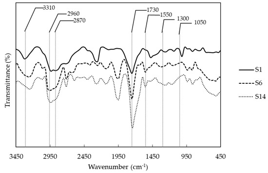 Representative infrared spectra of polyurethanes with different combination of polyols. (S1) PCL and PE, (S6) PCL, PEG and PE, and (S14) PEG and PE.